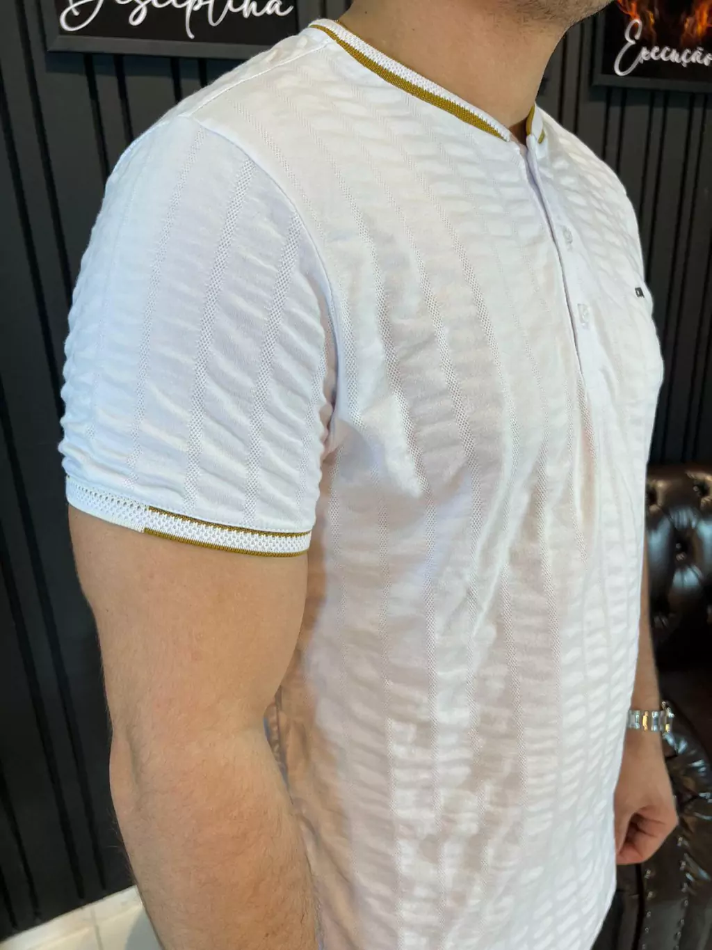 Com detalhes cuidadosamente trabalhados na manga e na gola, esta peça adiciona um toque de elegância e estilo a qualquer look. O design com gola Henley proporciona um visual moderno e versátil, ideal para diversas ocasiões.