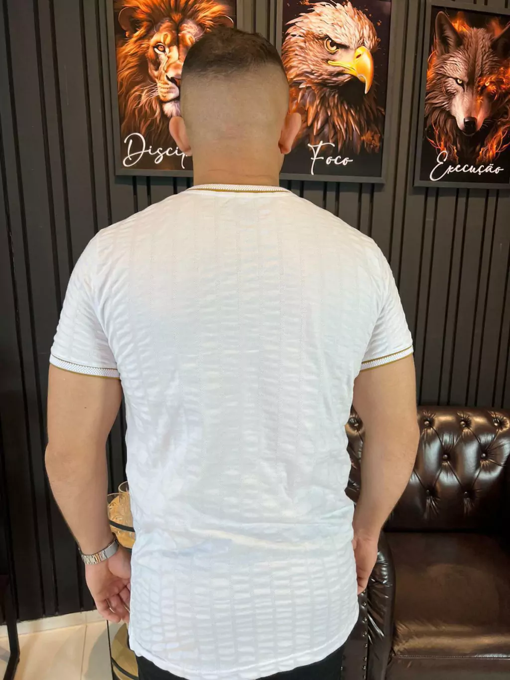 Confeccionada em piquet nobre com elastano, esta camisa oferece um toque excepcionalmente macio e resistente. O tecido de alta qualidade garante que a camisa não desbote, não perca a cor e não encolha, mantendo sua aparência nova e impecável por muito mais tempo.